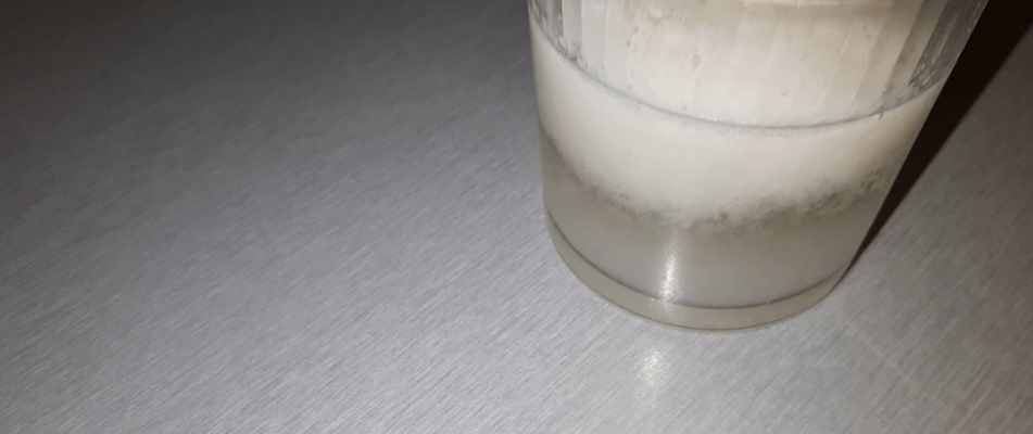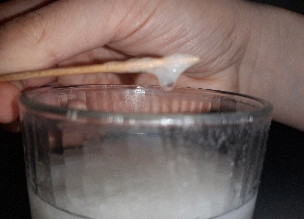 Korak 6: Nakon dovoljno vremena na dnu šolje ostaće tečnost, dok će na sam vrh isplivati mnogo sluzaste materije – to je DNK! Sada je možete zahvatiti čačkalicom ili drvenom kašičicom i vidieti izbliza kako izgleda.
