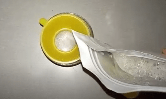 Korak 2: U čašu sipati toplu vodu, dodati so, pa tečnost za sudove i dobro promešati