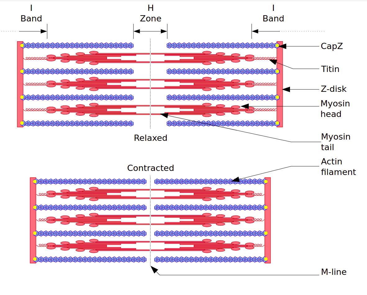 Ivice sarkomera ograničava Z-disk koji se sastoji od Z filamenata i α-aktinina. Od Z linije polaze aktinski filameti, a između njih se nalaze miozinski filamenti. Miozin se sastoji odglave i repa. Rep se prostire do sredine sarkomere, a glava je u bliskoj vezi sa aktinom. Na glavi se nalazi aktin-vezujuće mesto i miozinska ATP-aza, koje su neophodne za samu kontrakciju mišića. Na sredini sarkomere se nalazi M linija sačinjena od miomezina, koja drži miozin na mestu, a od M do Z linije se prostire tintin (ili distrofin) koji sprečava prekomerno rastezanje sarkomere.