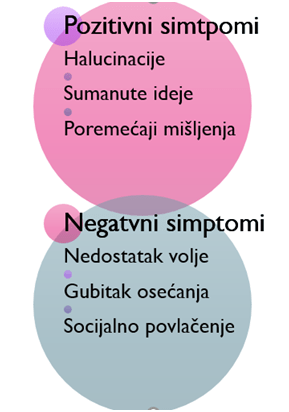 Shizofreniju I srodne poremećaje karakterišu psihotični simptomi kao što su sumanutosti I halucinacije. Ova bolest može bitinaročito onesposobljavajuća za pacijenta zbog svog toka, koji je, iako promenljiv, često hroničan I često se ponavlja. Kliničko ispoljavanje je raznoliko, ali se najčešće javlja u okviru akutnog I hroničnog sindroma. Simptomi kod shizofrenije mogu se podeliti na pozitivne i negativne. Pozitivni simptomi se češće javljaju u akutnim fazama ili u početnim fazama bolesti. Negativni simptomi se češće javljaju kod dugoročnog toka bolesti