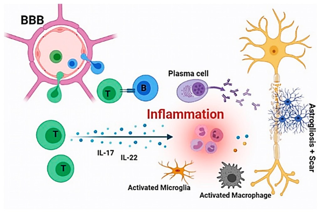 Jedan od glavnih odgovornih patofilizioloških procesa je zapaljenje. Glavne ćelije koje učestvuju u procesu zapaljenja su autoreaktivni T limfociti podstaknuti od strane B limfocita. Postoji veliki broj faktora koji potencijalno može aktivirati T limfocite da napadaju ćelije sopstvenog organizma. Jedan od faktora su virusi kao što je na primer Epštejn Barov virus.Raziličite meta analize su pokazale da je veliki broj ljudi sa MS u nekom periodu života preležao mononukleozu i da postoji mogućnost formiranja antigenske mimikrije. T limfociti u toku procesa zapaljenja veoma uspešno prolaze krvno moždanu barijeru i dospevaju do tkiva mozga. U samom tkivu dolazi do njihove reaktivacije kada dođu ukontakt sa dendritskim ćelijama, makrofazima i B limfocitima. Reaktivacijom dolazi do otpuštanja materija poput citokina i hemokina koji podstiču proces inflamacije i privlače ćelije da dođu baš tu i pomognu im u procesu napadanja oligodendrocita. Kada inflamatorne ćelije napadnu oligodendrocite oni umiru i to se naziva proces demijelinizacije.