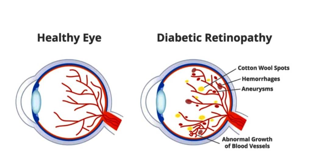 Diabetes mellitus (šećerna bolest) za jednu od najkompleksnijih posledica ima oštećenje vida. Povišena koncentracija šećera u krvi dovodi do oštećenja krvnih sudova i nastanka aterosklerotskih promena. Dolazi do smanjenog protoka krvi i ishemije mrežnjače. Kao odgovor na ishemiju, nastaju novi krvni sudovi, koji bi za cilj imali da vrše dotok krvi, ali usled propuštanja tečnosti u okolna tkiva, mehanizam odbrane dovodi do daljeg oštećenja tkiva. Istraživanja pokazuju da početak dijabetesne retinopatije nastaje u proseku sedam godina pre otkrivanja dijabetesa tipa 2.