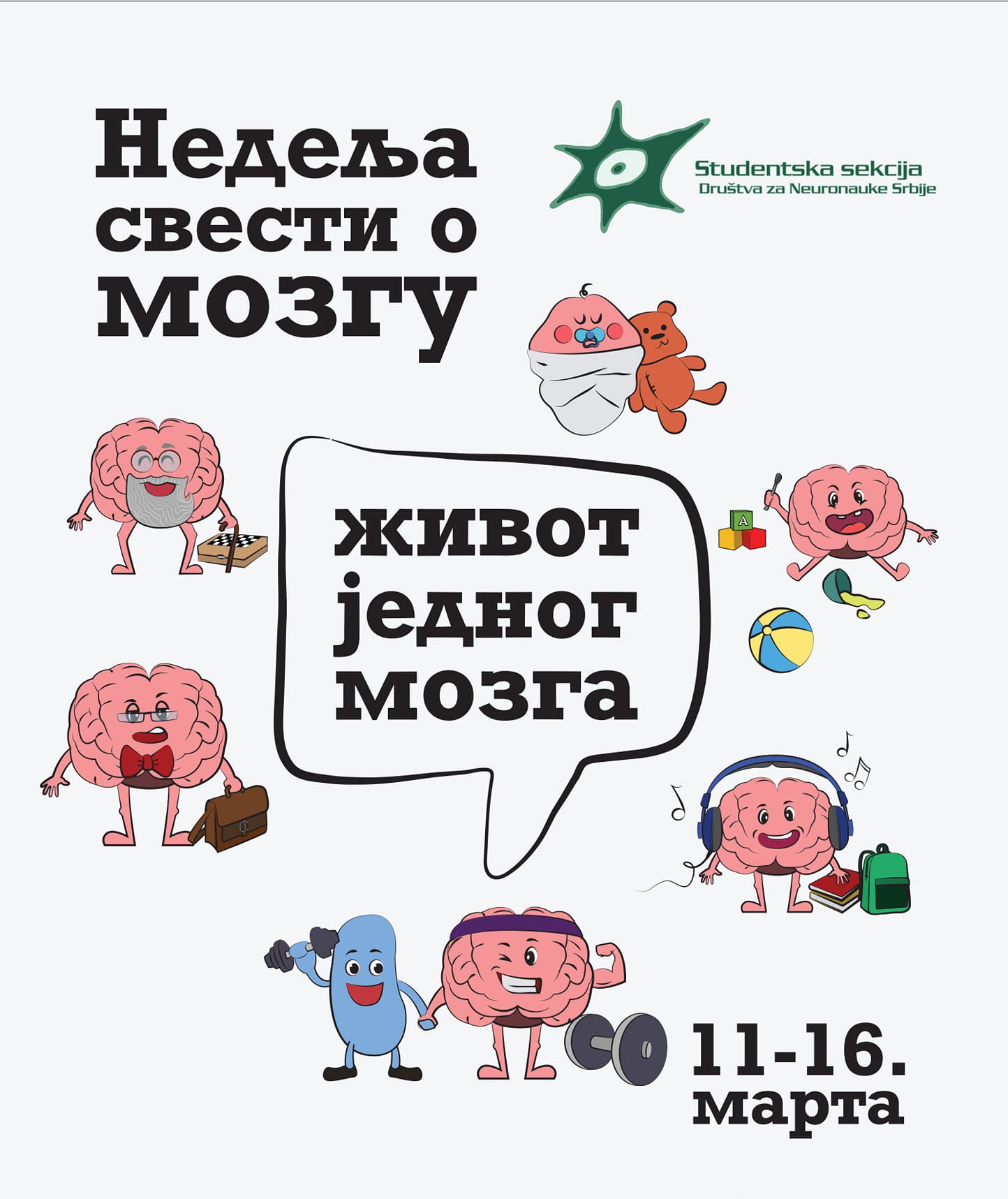 Studentska sekcija Društva za neuronauke Srbije ove godine slavi 10. rođendan i 8. put za redom organizuje globalnu manifestaciju – Nedelju svesti o mozgu. Studenti biologije, medicine, farmacije i psihologije su se potrudili i pripremili raznovrstan program na temu razvića nervnog sistema pod sloganom „Život jednog mozga“. Manifestacija će se održati u periodu od 11 – 16. marta na nekoliko lokacija u gradu.